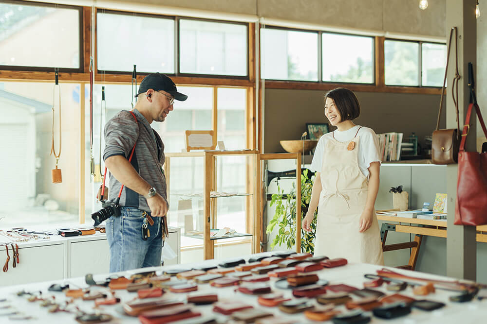 ひときわ賑わっていたのが「下タ町醸し室HIKOBE」。1688年創業の「福禄寿酒造」の日本酒や、酒粕をつかったスイーツなどを楽しむことができる店だ。革製品が並ぶ「革小物すずなり」では、愛用品のお直しやお手入れの相談に来ている常連客の姿が見られた。地元のものを大切に長く使うことができる環境が育まれている空気を感じ、心地よい気持ちになる。