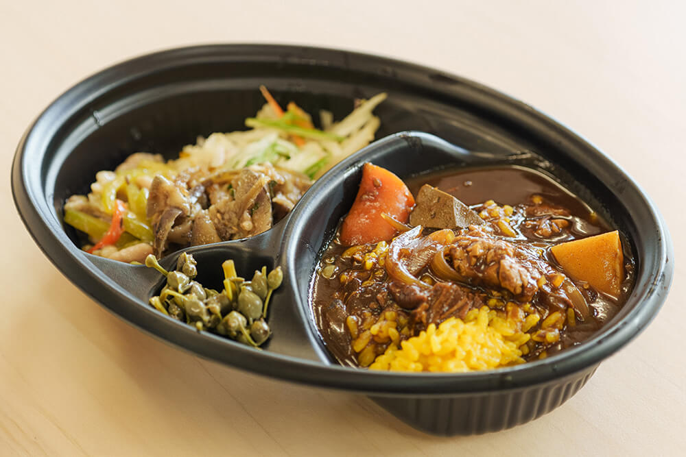 第2部を前に、施設1階にある「ポコポコキッチン」でランチを兼ねた交流会が開催された。狩猟免許をもつBABAME BASEの運営メンバーが捌いたという熊肉を使ったカレーを、丸いテーブルに座って参加者と雑談をしながら口へ運ぶ。人生初の熊肉。筋肉質で固いのかと思いきや、脂味があって柔らかく、臭みもない。おいしい。聞けば、仕留めてすぐの新鮮な熊肉を2日間煮込んでいるという。体温が上昇し、エネルギーが湧いてくるのを感じた。