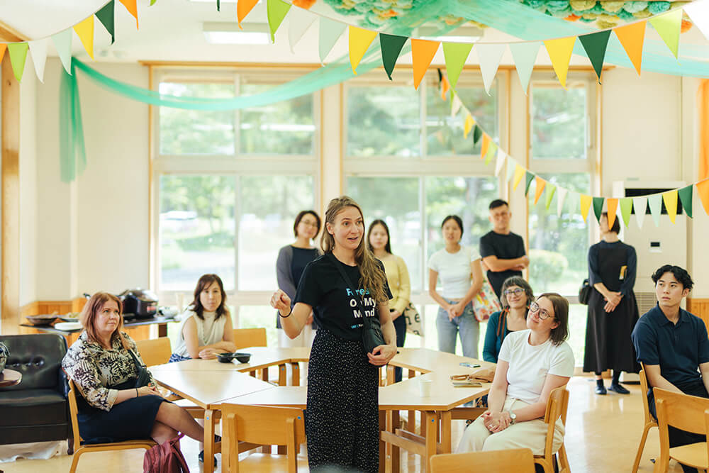 交流会では、フィンランドからやってきたゲストたちによる自己紹介もあった。フィンランド北カレリア州の研究者や起業家で、ソウゾウの森プロジェクトの「森を基盤とした価値創造を通じた自律的な豊かさの共創」と類似したビジョンを掲げ、地域振興に取り組んでいる。秋田県と同地域の経済連携プラットフォームを提案するシンポジウムが秋田市で開かれることを機に来日し、ソウゾウの森会議に参加。朝ぷらを体験し、BABAME BASEにも一緒に来ていた。