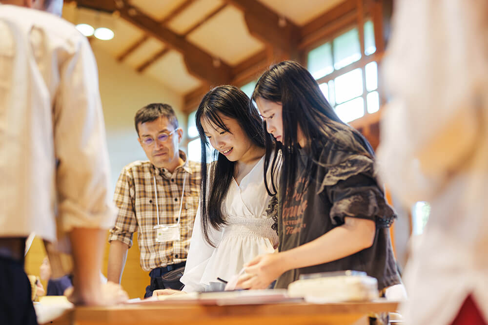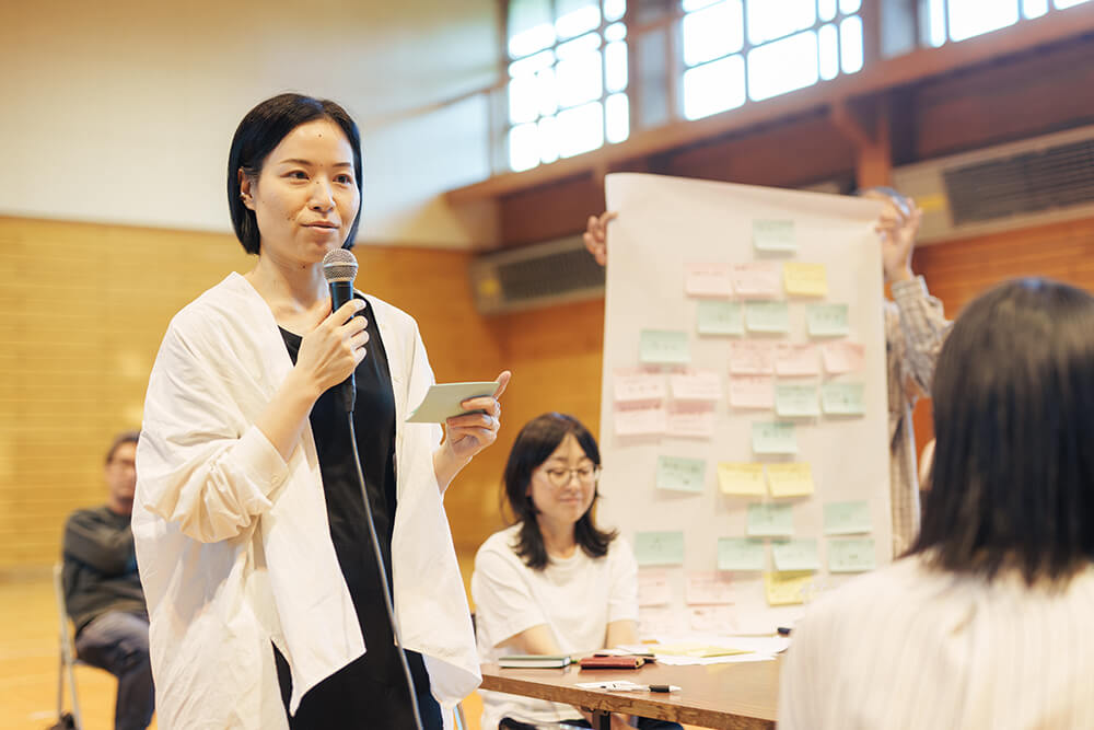その後、各グループがアイデアの一部を発表。「朝市の出店(でみせ)をまわって定食をつくる」「遠方からゲストに出演してもらう」「山菜やキノコの食べ方を教えてもらうワークショップを開催する」「みんなでラジオ体操をする」など、朝市のコンテンツをさらに充実させるアイデアが多く寄せられた。