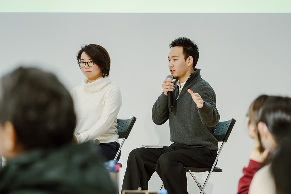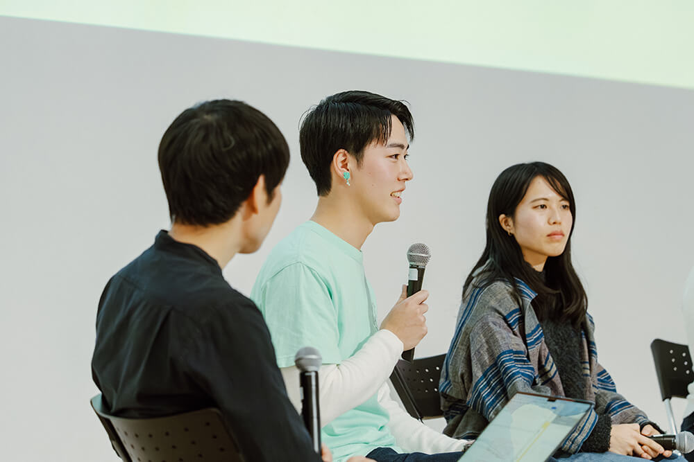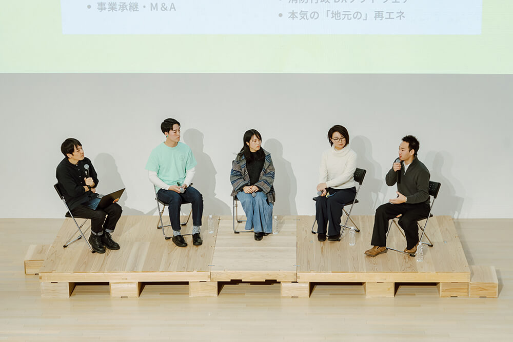 気づきや学びを得るのは主催する側に留まらない。続く「実りの森〜これまでの歩みを振り返る〜」と題されたセッションで壇上に上がったのは、能代市地域おこし協力隊の江南綾絃さん、にかほ市で地域プロジェクトマネージャーとして働く國重咲季さん、田舎の長男の嫁の金陽子さん、東北物産株式会社で新規事業開発部のプロジェクトリーダーを務める松永祥次郎さんだ。