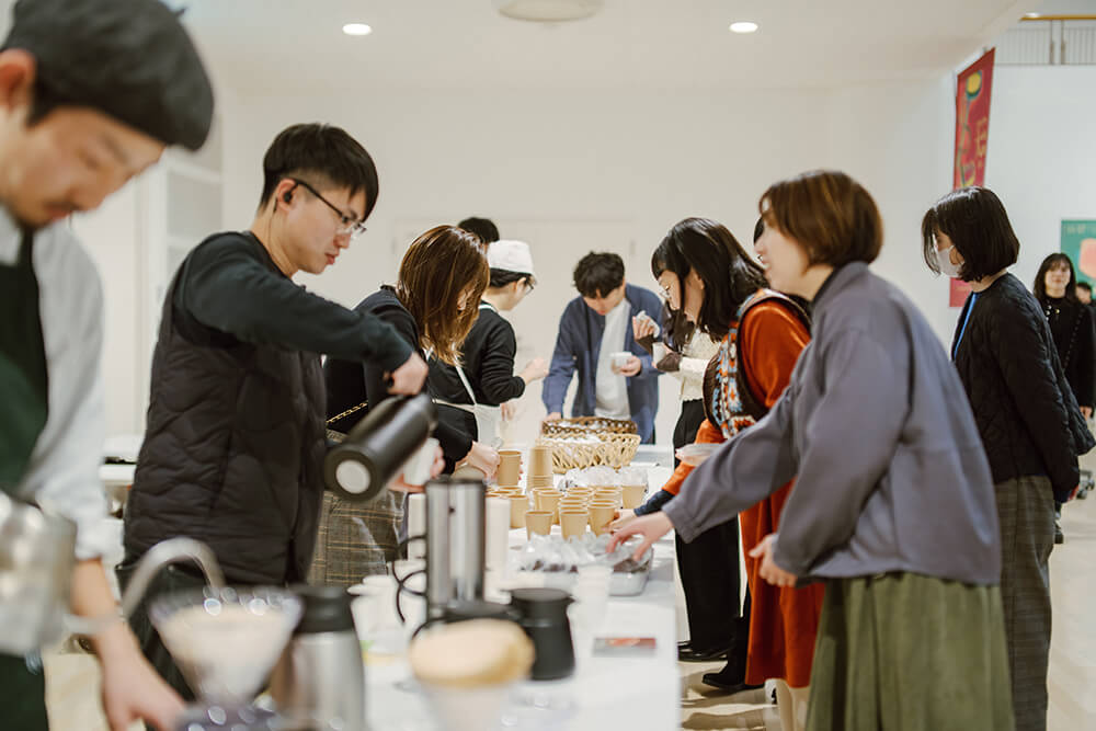 五城目の「福禄寿酒造」の甘酒は、酸味が利き、さっぱりながら、しっかりお腹にたまるエネルギーチャージ。合わせるのは、同酒造の酒粕を使った「さとう菓子店」の甘塩っぱいパウンドケーキ。欲張って、「豆腐百景」と「マザー食堂savu.」のコラボレーションによるおからクッキーもお土産にもらった。食感はオートミールのようなザクザク感、一方でそこまで重くない食後感はおからならではだろうか。訪れたことのある店内の様子が目に浮かび、作り手の表情が直に伝わってくる。第11回の地域主催者であった「さとやまコーヒー」は、駅前の百貨店への実店舗オープンと重なり忙しい時期であったが、ドリンクの選択肢を1つ増やしてくれた。