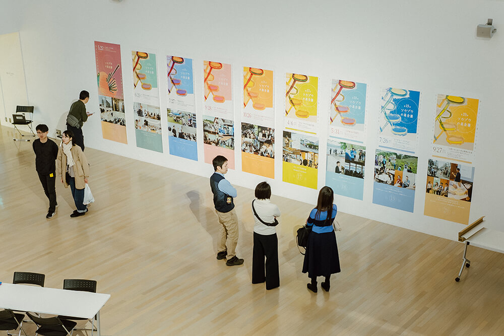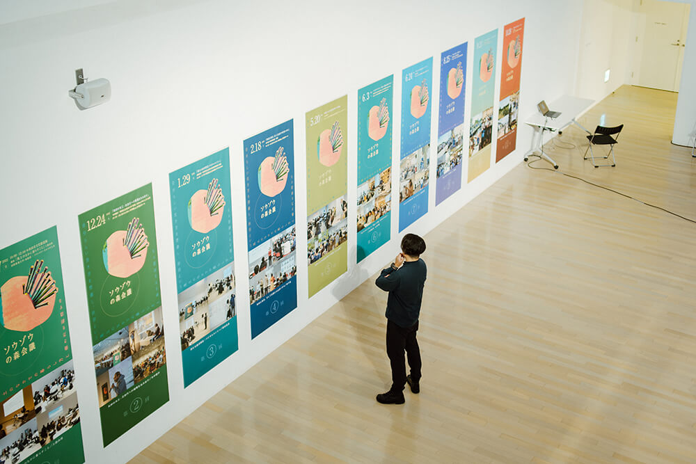 館内で催されている他の行事の賑やかさを横目に、2階のスタジオAへ。会場入って左側の壁には、参加者の種が根を張り、芽吹いた1〜2年目。右側の壁には、それぞれがつながり、枝葉を広げ、ネットワークとなってきた3〜4年目の会議の様子がバナーとして展示されており、長いプロジェクトの歩みを描き出していた。