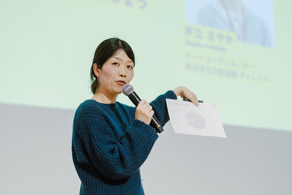 まずは参加者の緊張を解きほぐし、互いを知るためのアイスブレイク。ファシリテーターは、秋田市文化創造館ディレクターの芦立さやかさんだ。手元に配られたのは、木の年輪が描かれたワークシート。ピザのように三分割された木の断面の1ピースごとに、自身のお気に入りの場所のヒント「どんな場所か?」「何をして過ごすか?」などを書き込む。