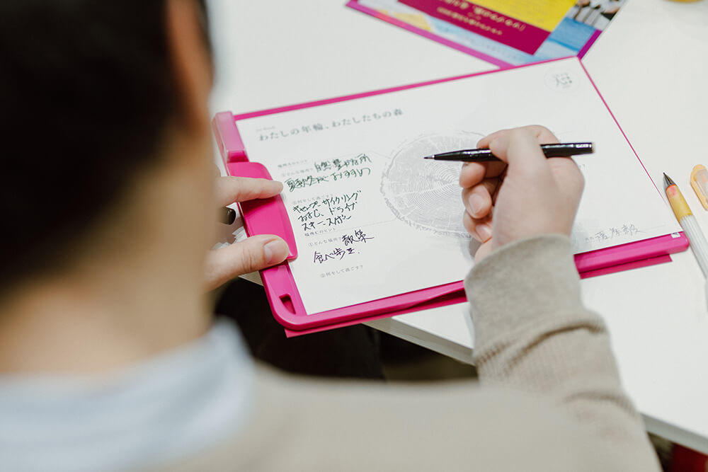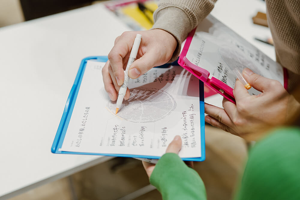 お互いにとって身近な場所であると当てることができ、正解すればワークシートに描かれた木の年輪をカラーマーカーで塗りつぶす。人との会話を繰り返すことで、木の年輪が一層また一層と成長する様子が表現されており、ソウゾウの森会議が目指す、人との出会いや交流の重要性が伝わってくるワークに感じた。