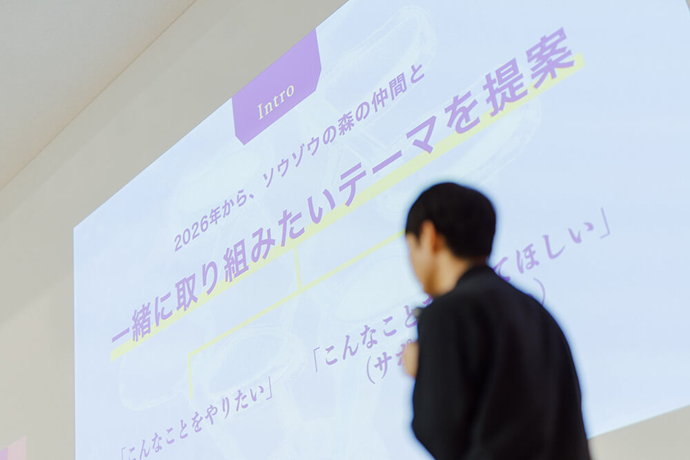 これまでのプログラムを通じて、参加者の間にソワソワが少しずつ広がってきた。ここで、主催の工藤尚悟さん、林千晶さんから次年度以降のソウゾウの森会議について発表がある。