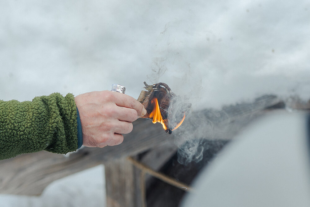 30分ほど歩むと、小山の頂についた。そこに佇む小さな祠の前に皆が集まったところで、船橋さんが道中に拾った樺の木の皮(ガンビと呼ばれる)にマッチで火を灯しながら、「油分が多いので濡れていてもよく燃えますよね。マタギの人は暖をとるのに重宝したそうです」と昔からの知恵を教えてくれる。よく燃えるガンビの横で二礼二拍一礼、皆でお参りをする。