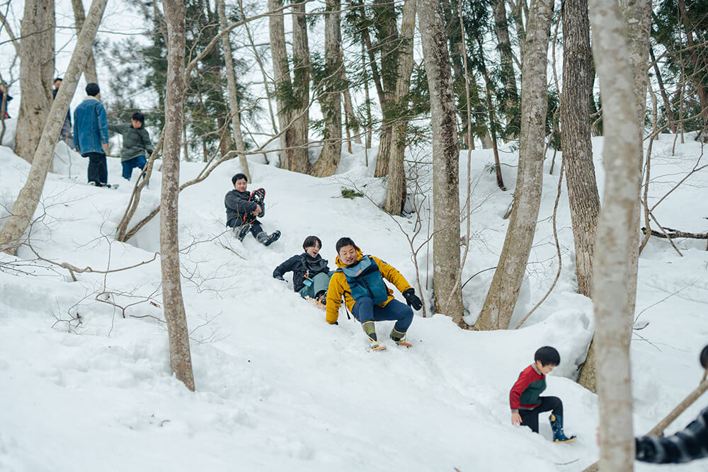 「来た道を戻っても良いし、雪山をお尻で滑って下りても良いよ」と加藤さん。せっかくなので、滑ることにした。あまり一点に体重をかけすぎると埋まる。滑りながら、スポッとハマった人たちの長靴やかんじきを一緒に捜索し、ケラケラと笑いながら童心に返り道路まで下りる。呼吸に意識がいく、清々しい時間。スノーシューを脱ぎ、ゆっくりと歩きながら、根子児童館に戻った。