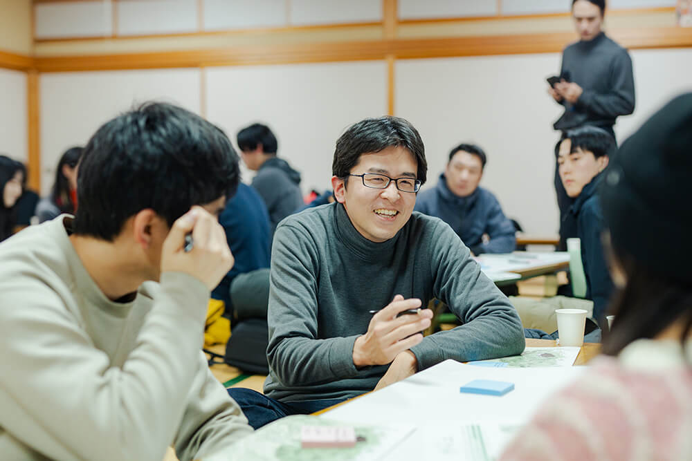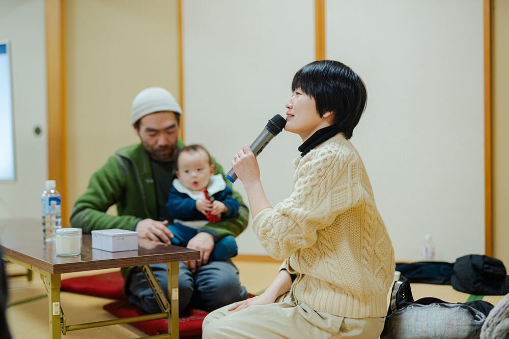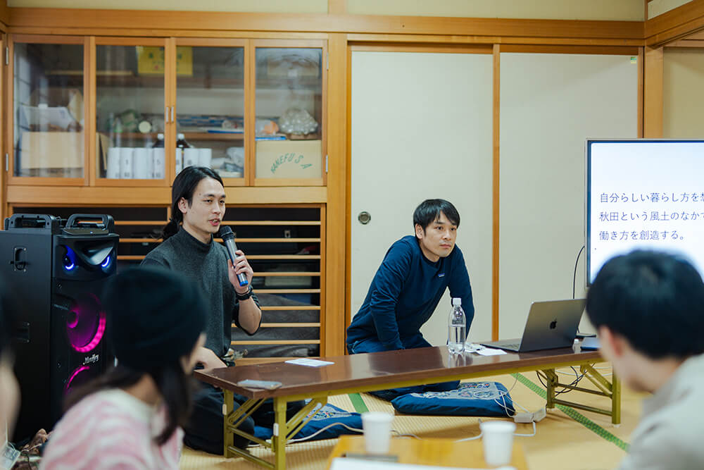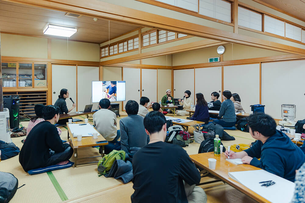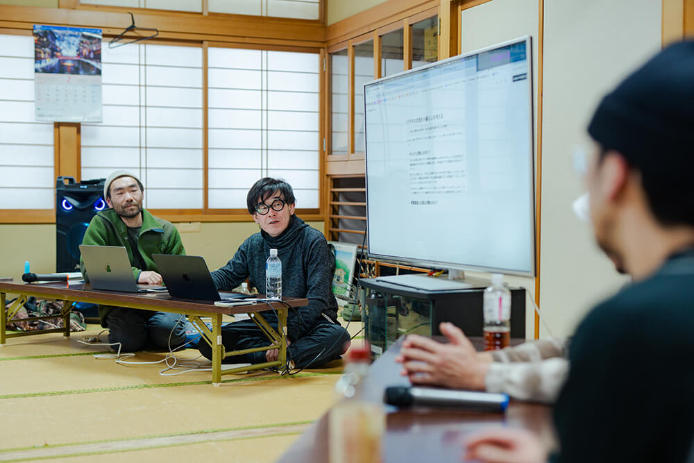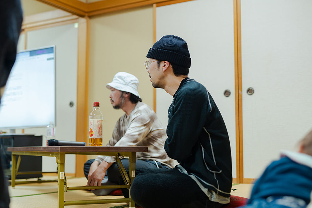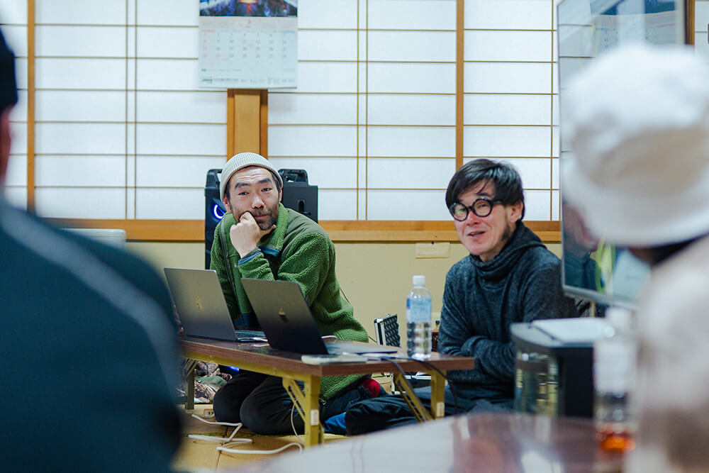 温かい飲み物で一息つく中、主催である国際教養大学の工藤尚悟先生から会議の趣旨が説明される。ソウゾウの森プロジェクトは、秋田の7割を占める山や森をどのように活かし、価値に変換していくかに向き合ってきた。木材利用に限らず、山から田んぼに流れる水、森林が生み出す空気や環境、またそれらと共にある風土や暮らし。これらの価値をどのように引き出し、人々が自律した豊かさを実現していくか考え、形にしていく取り組みである。山に囲まれ、独特の風土が今もなお受け継がれるこの根子と船橋さん、本城さん、加藤さんがどのように出会い、移り住んだのか?ここから考えを始めてみる。