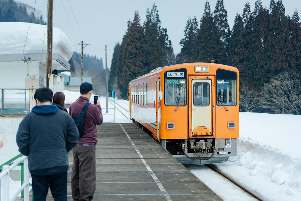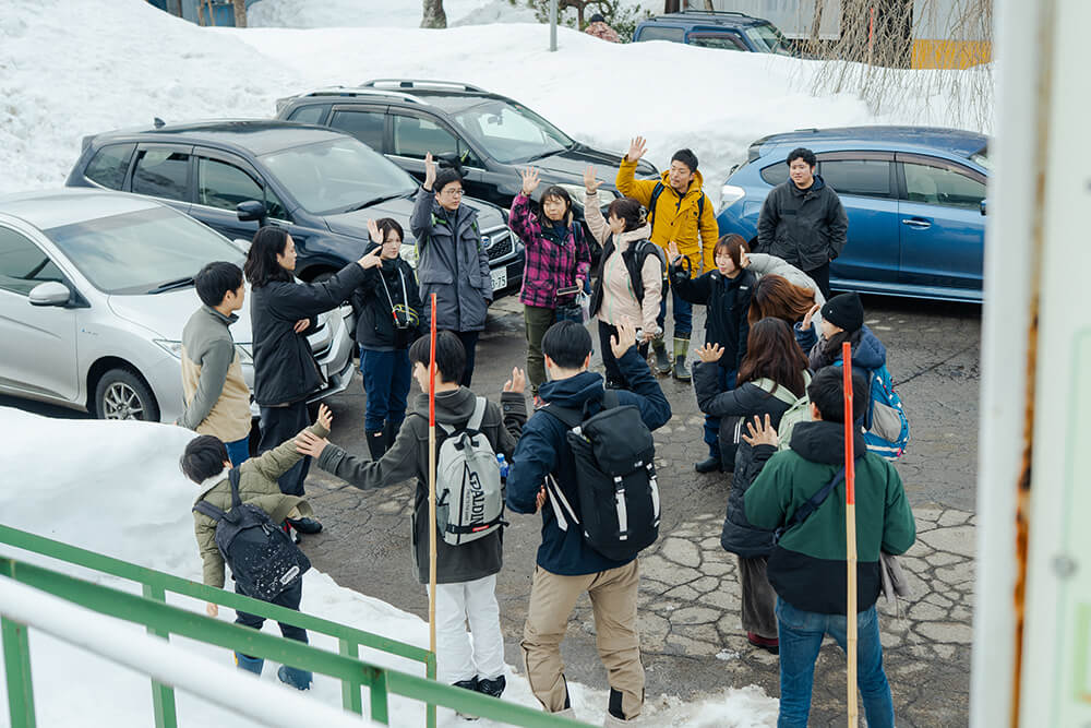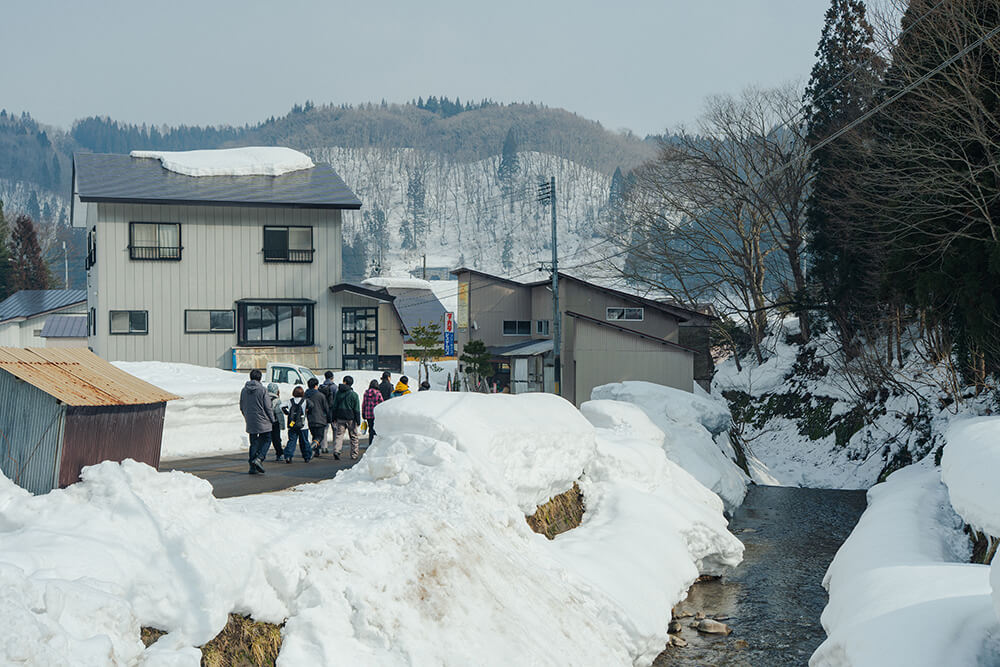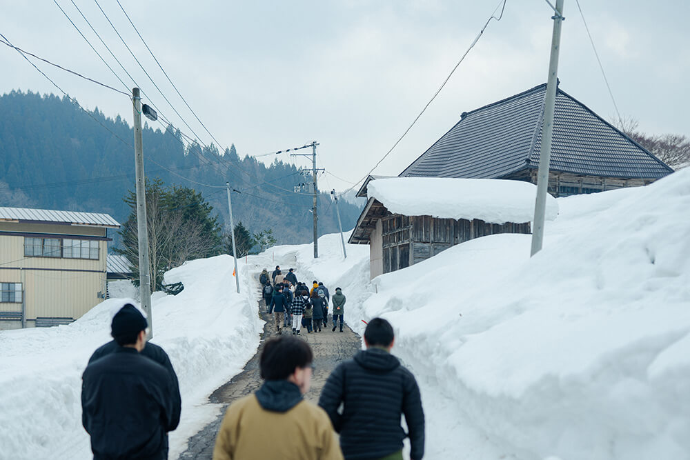 雪が積もり、辛うじて線路だけが露出する笑内駅に、参加者が到着し、迎えに来たメンバーと合わせ総勢20人ほどが揃った。駅から集落まで、両側を雪に覆われた山道を進む。目の前に現れたのは小さないくつかの電灯で照らされた、車一台ほどの幅しかないトンネル。ここが根子集落への冬期唯一の出入り口だ。「前から車が来たらどうするんだろう?」と心配する大学生に、2回目の来訪だという参加者が「いくつか待避所があるから大丈夫だよ」と答える。そろそろと車を進めると、トンネルの先に白い光が差し込む。抜けた先は、集落全体が見渡せる小高い場所。車を停め、積もった雪の壁の向こうに視線をやるため背伸びをし、景色を眺める。