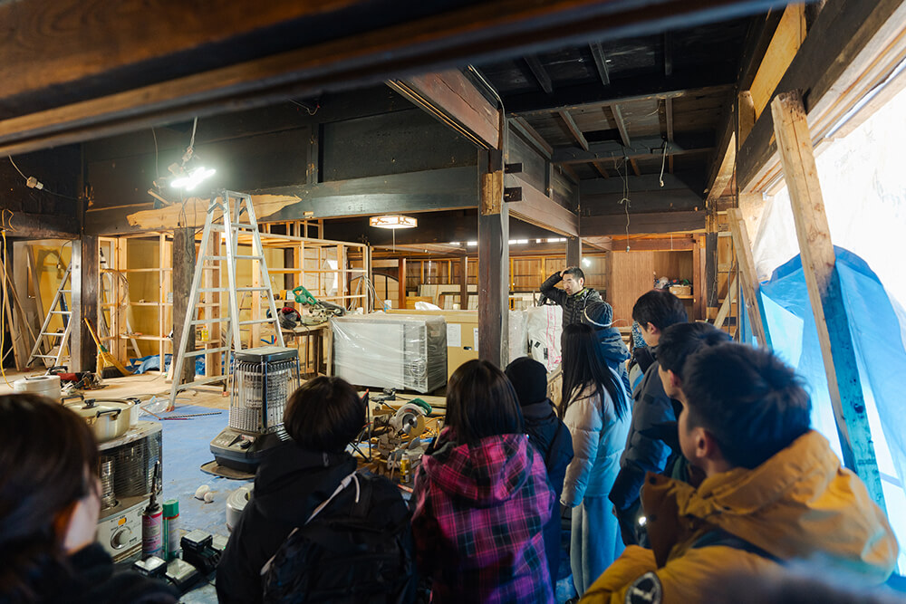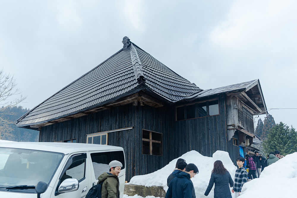 ウヘエとなる建物は瓦風の大きなトタン屋根、焼杉で覆われた黒い外壁も相まって、集落の中でひときわ目立つ。元は狩猟で獲った熊の胆(胆嚢)を用いた薬の販売を生業にする家だったとのこと。春の完成を前に急ピッチで大幅改装中であり、土間から見渡せる室内、独特な開口部から見える解体処理施設の一角など、近隣地域から集まった大工さん、建具屋さん、左官屋さんの作業が手に取るように感じられた。